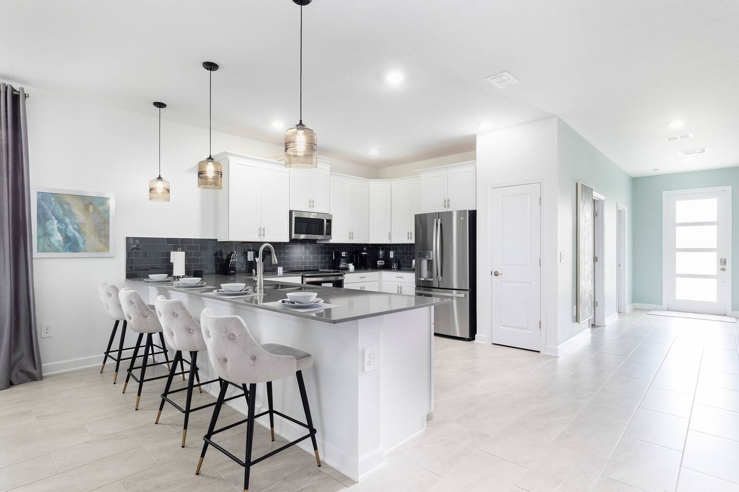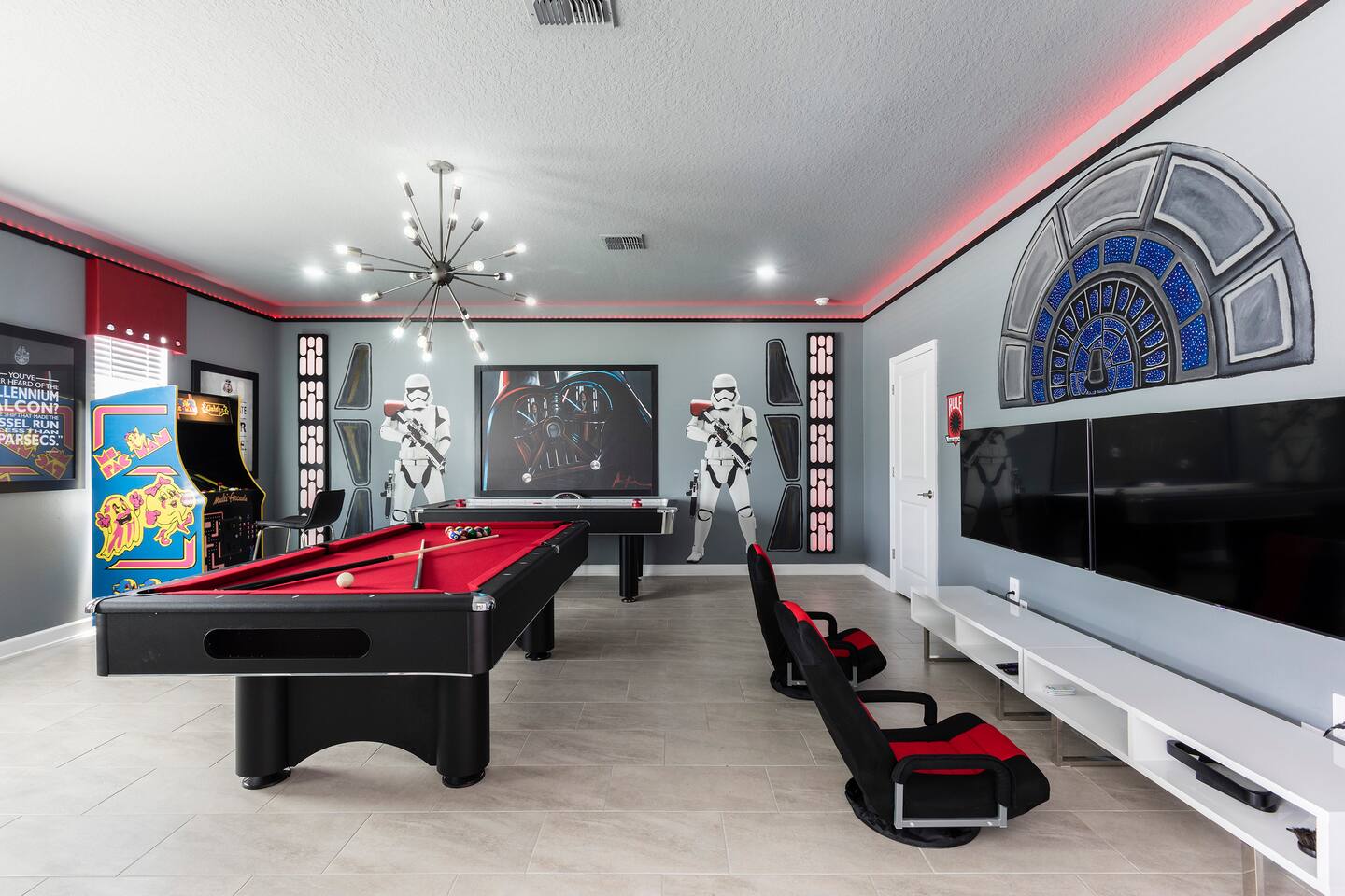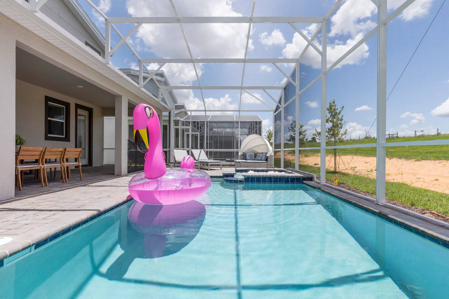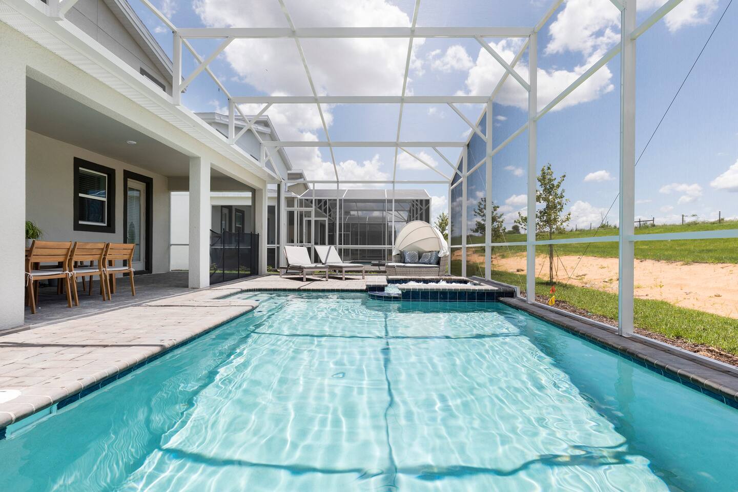 This new construction home (2022) has been crafted by a legendary local interior designer that has designed it with modern decor and brand new furnishings throughout. The home has a theater with an 80-inch TV and speaker system. The game room includes a PS5 console and two 4K TVs, air hockey, pool table and a classic arcade game with Pac Man. The home has seven kings sized beds and one bunk bed. It has brand new appliances and kitchen equipment. There's two loungers and a day bed by pool. There's an outdoor table for eating. There's also a washer and dryer. Champions Gate has 2 resort-style clubhouses: The Oasis clubhouse: * Resort clubhouse with two pools and a lazy river * Kids splash-zone * Poolside tiki bar and cabanas * Hot tubs *Tennis, volleyball, and basketball courts * The Oasis Club Grill Room bar and restaurant * Arcade and movie theater * Fitness center and sundry shop * Children's play center * 18-hole championship golf course, pro-shop, restaurant, and bar * Gated and guarded entrance The Retreat Clubhouse: *2 HUGE waterpark slides! *Resort style pool *Outdoor full-service bar & restaurant *Mini-Golf($5) *Events stage & grass seating area *Kids splash-zone