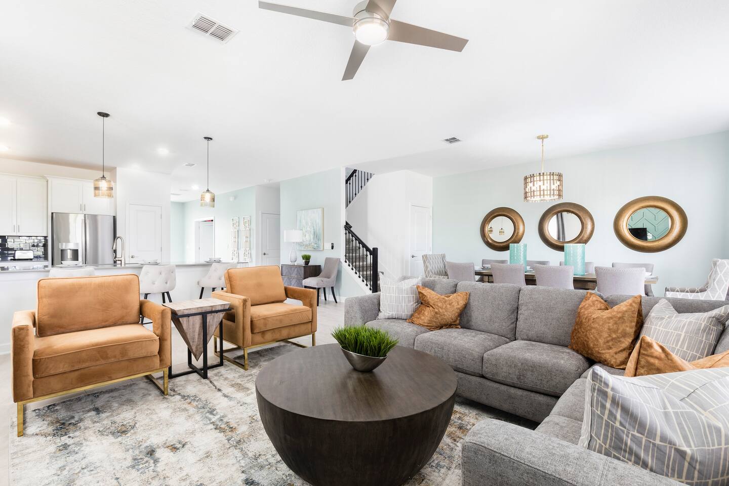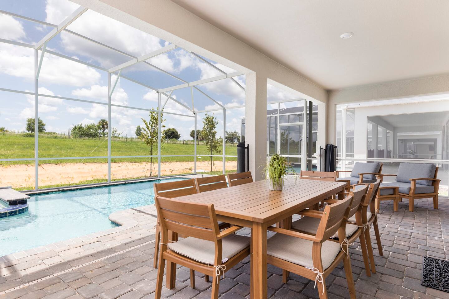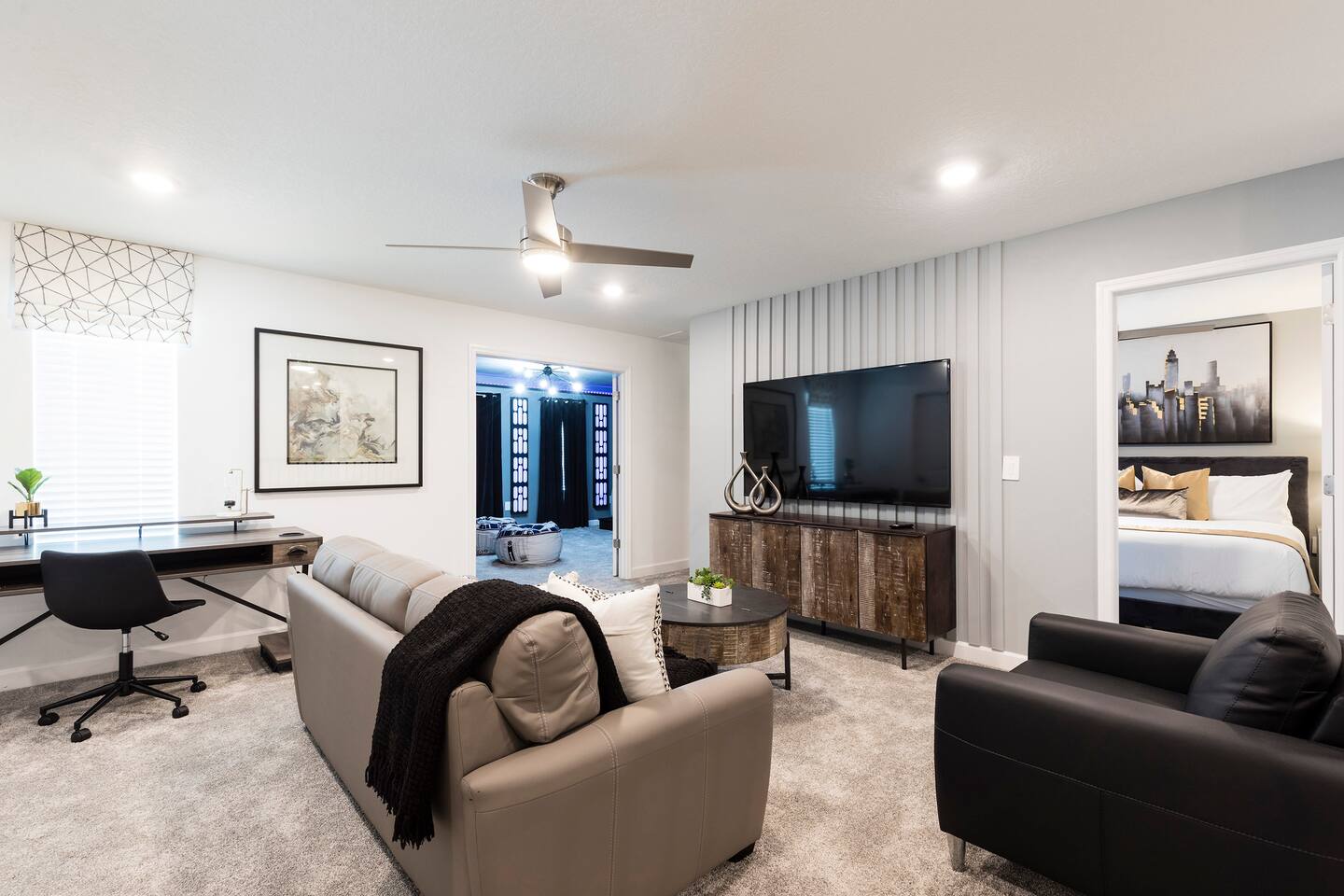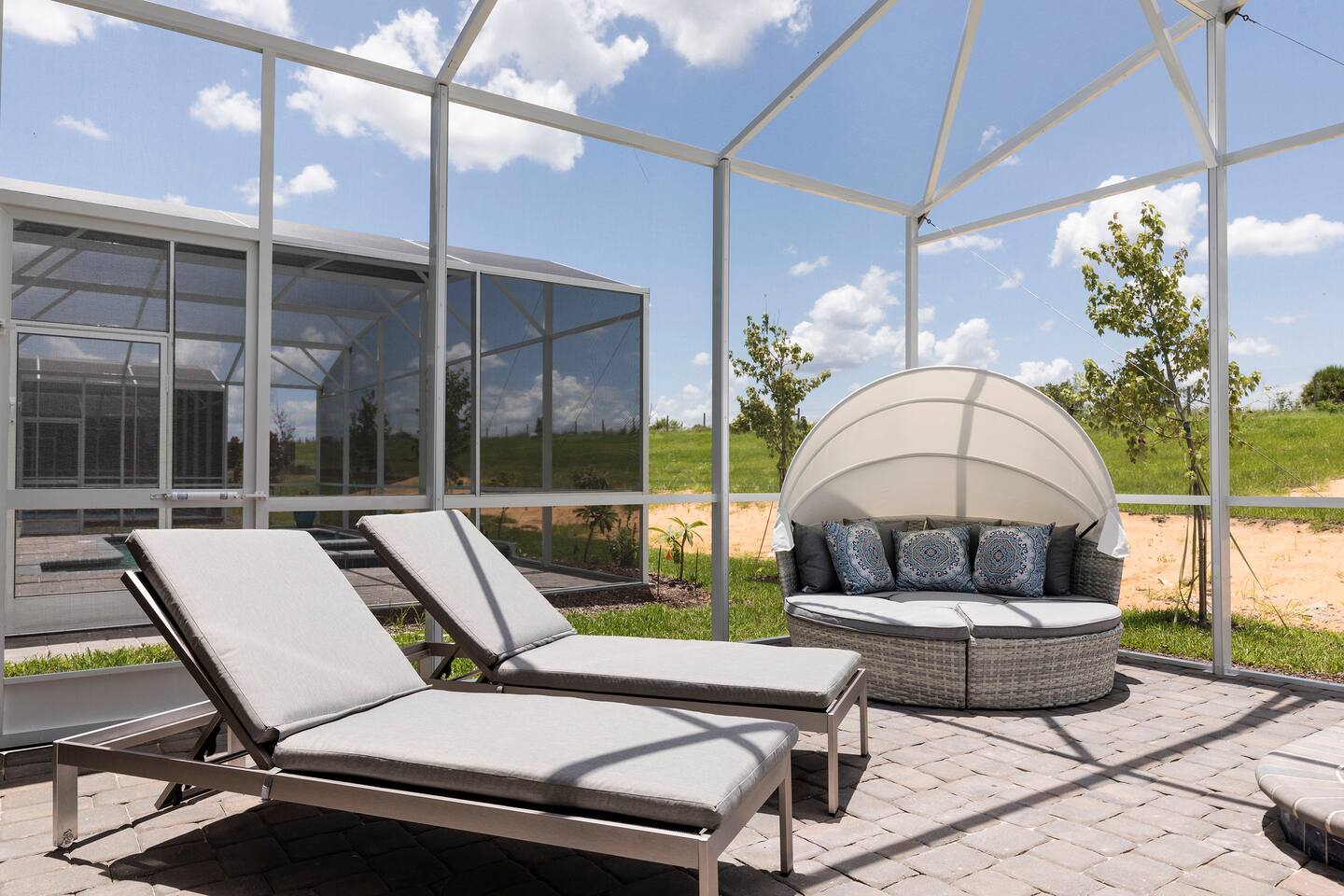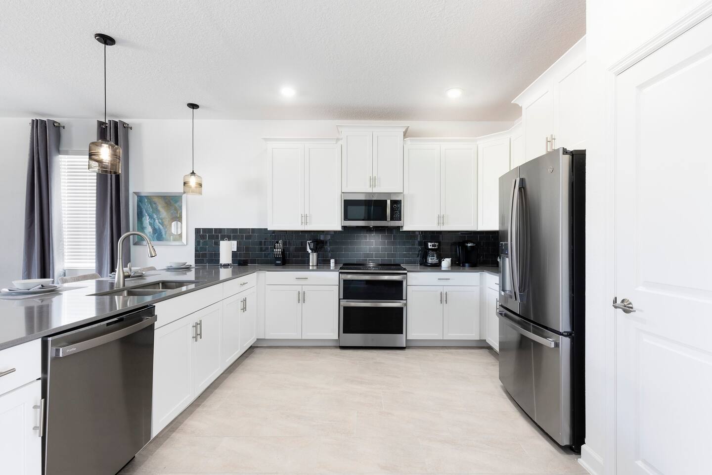 This new construction home (2022) has been crafted by a legendary local interior designer that has designed it with modern decor and brand new furnishings throughout. The home has a theater with an 80-inch TV and speaker system. The game room includes a PS5 console and two 4K TVs, air hockey, pool table and a classic arcade game with Pac Man. The home has seven kings sized beds and one bunk bed. It has brand new appliances and kitchen equipment. There's two loungers and a day bed by pool. There's an outdoor table for eating. There's also a washer and dryer. Champions Gate has 2 resort-style clubhouses: The Oasis clubhouse: * Resort clubhouse with two pools and a lazy river * Kids splash-zone * Poolside tiki bar and cabanas * Hot tubs *Tennis, volleyball, and basketball courts * The Oasis Club Grill Room bar and restaurant * Arcade and movie theater * Fitness center and sundry shop * Children's play center * 18-hole championship golf course, pro-shop, restaurant, and bar * Gated and guarded entrance The Retreat Clubhouse: *2 HUGE waterpark slides! *Resort style pool *Outdoor full-service bar & restaurant *Mini-Golf($5) *Events stage & grass seating area *Kids splash-zone