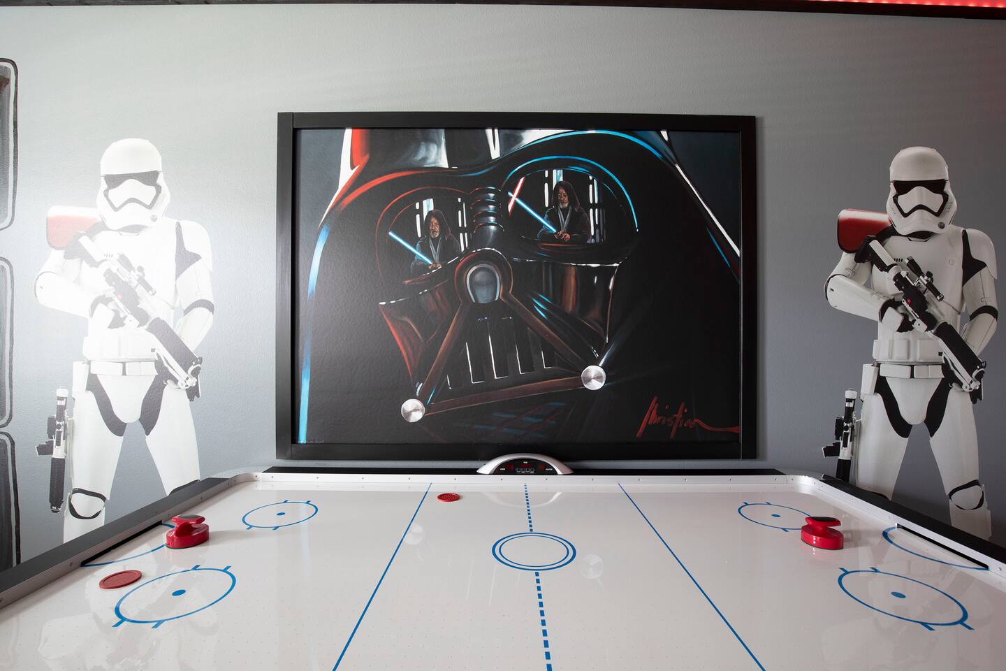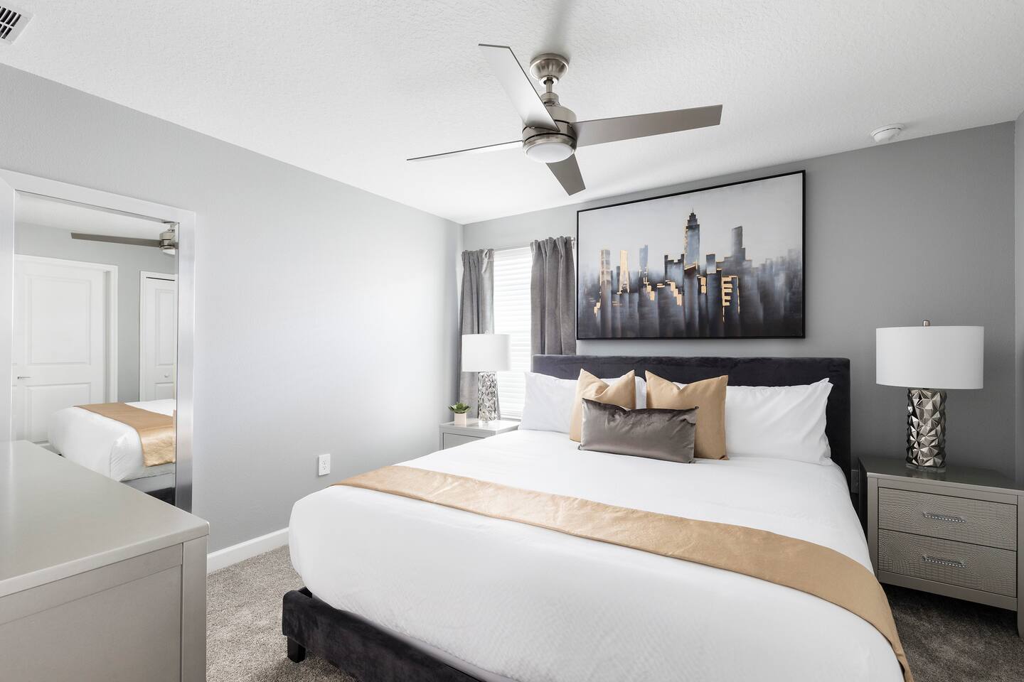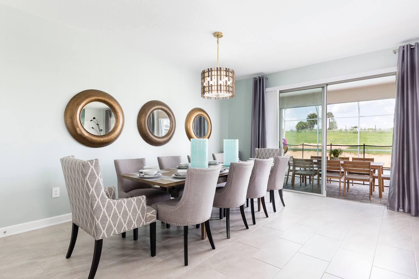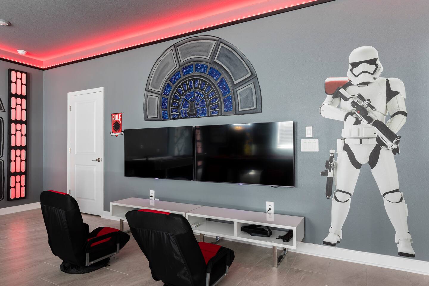 This new construction home (2022) has been crafted by a legendary local interior designer that has designed it with modern decor and brand new furnishings throughout. The home has a theater with an 80-inch TV and speaker system. The game room includes a PS5 console and two 4K TVs, air hockey, pool table and a classic arcade game with Pac Man. The home has seven kings sized beds and one bunk bed. It has brand new appliances and kitchen equipment. There's two loungers and a day bed by pool. There's an outdoor table for eating. There's also a washer and dryer. Champions Gate has 2 resort-style clubhouses: The Oasis clubhouse: * Resort clubhouse with two pools and a lazy river * Kids splash-zone * Poolside tiki bar and cabanas * Hot tubs *Tennis, volleyball, and basketball courts * The Oasis Club Grill Room bar and restaurant * Arcade and movie theater * Fitness center and sundry shop * Children's play center * 18-hole championship golf course, pro-shop, restaurant, and bar * Gated and guarded entrance The Retreat Clubhouse: *2 HUGE waterpark slides! *Resort style pool *Outdoor full-service bar & restaurant *Mini-Golf($5) *Events stage & grass seating area *Kids splash-zone